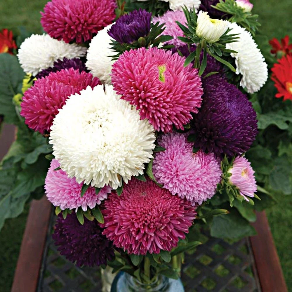 Астра Большая Хризантема в смеси из ярких розово-фиолетовых тонов – это простой и действенный способ разнообразить посадки на клумбах, при этом сразу посадив красивые сорта. Мы подобрали такое сочетание, которое максимально гармонично и естественно смотрится на клумбах. Астры серии Большая Хризантема очень крупные, фактически достигающие размеров цветов серии Русский Размер. При этом куст более приземистый с мощными цветоносами. На одном кустике развивается около 20 цветов. Смесь Большая Хризантема – прекрасный вариант, чтобы сразу собрать праздничный букет!