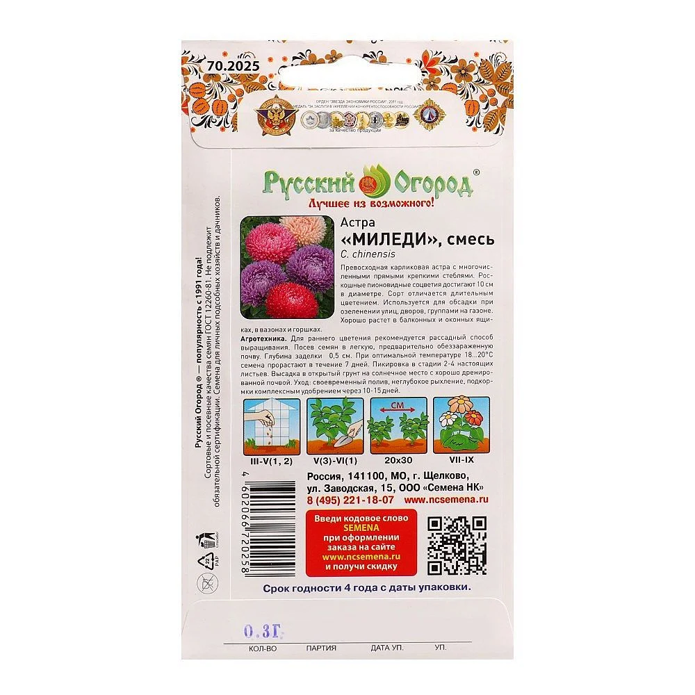 Семена астры "Астра Миледи, смесь" на рассаду высевают в марте — апреле. Первые всходы можно наблюдать спустя неделю при температуре 15-18 градусов. Высаживают рассаду на постоянное место в мае — начале июня. Участок для астр "Астра Миледи, смесь" выбирают солнечный, защищенный от ветра, с плодородными, известкованными, хорошо дренированными почвами. Между растениями рекомендуют при высадке придерживаться расстояния до 20 см. Высота взрослого куста достигает до 25 см. Цветочки густомахровые, диаметром до 10 см, окрашены в насыщенные яркие оттенки красного, синего и сиреневого.