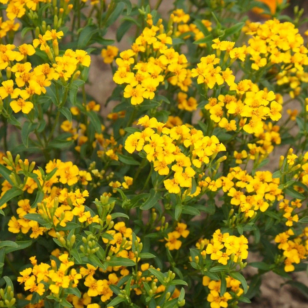 Бархатцы лучистые Мексиканский эстрагон – яркие садовые цветы, причём источают приятный запах не только сами цветки, но и стебли с листьями. Их кустики достигают 20 сантиметров в высоту.