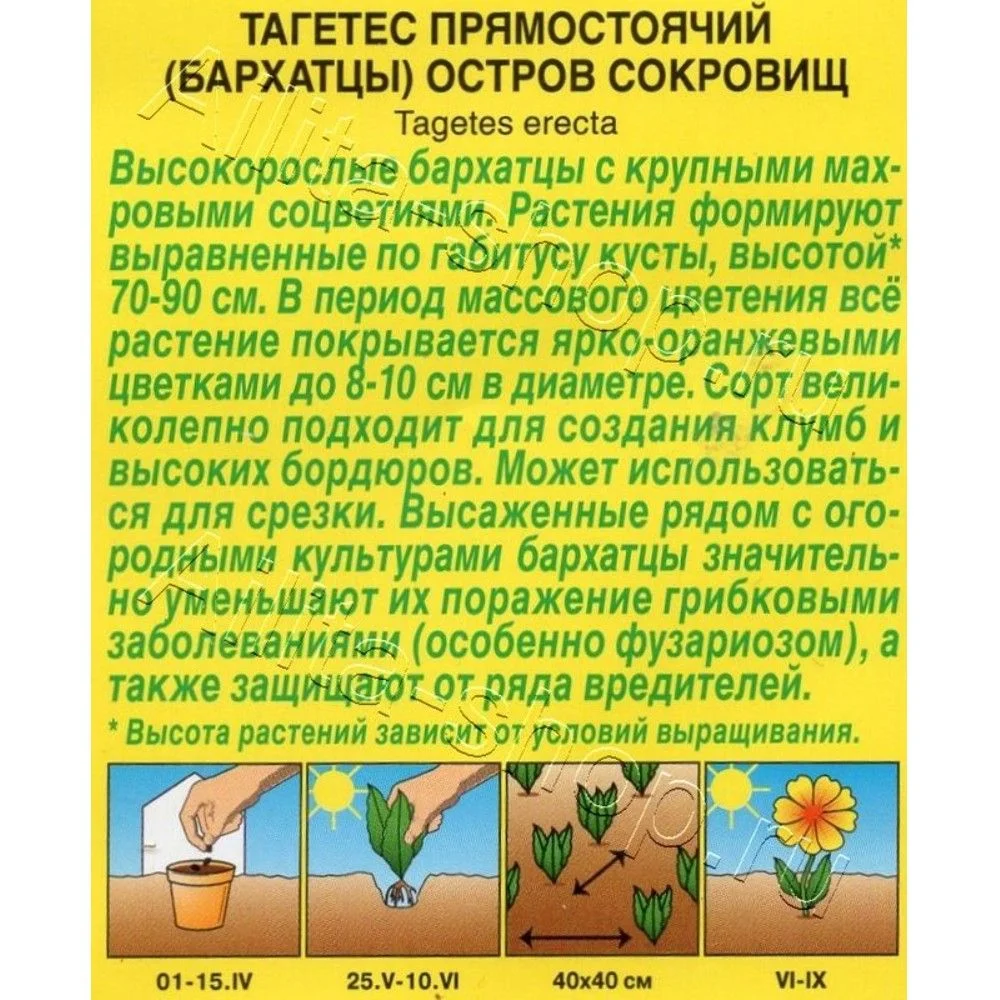 Высокорослые бархатцы с крупными махровыми соцветиями. Растения формируют выравненные по габитусу кусты, высотой 70-90 см. В период массового цветения всё растение покрывается ярко-оранжевыми цветками до 8-10 см в диаметре. Сорт великолепно подходит для создания клумб и высоких бордюров. Может использоваться для срезки. Высаженные рядом с огородными культурами бархатцы значительно уменьшают их поражение грибковыми заболеваниями (особенно фузариозом), а также защищают от ряда вредителей. * Высота растений зависит от условий выращивания. Бархатцы предпочитают солнечные участки с дренированными, плодородными почвами нейтральной кислотности. Растения теплолюбивые, быстрорастущие, взрослые – достаточно засухоустойчивые.