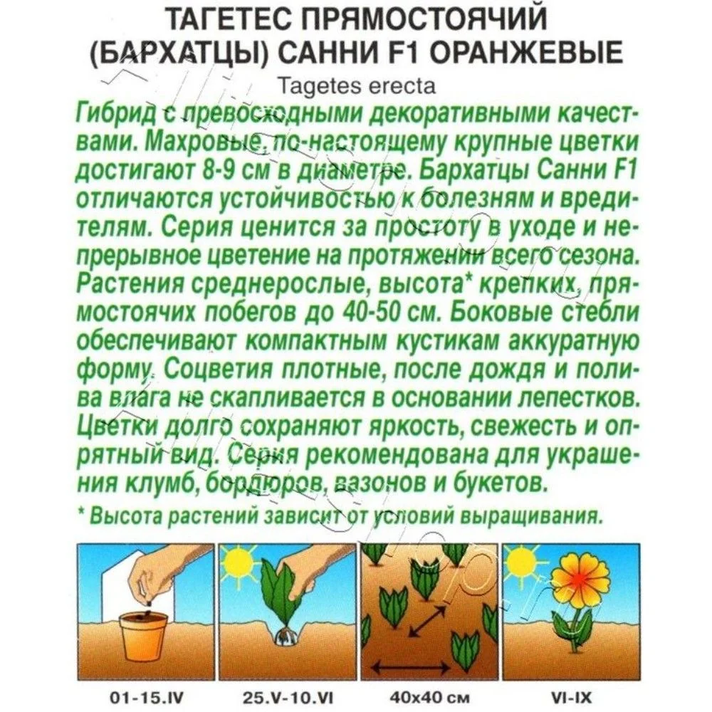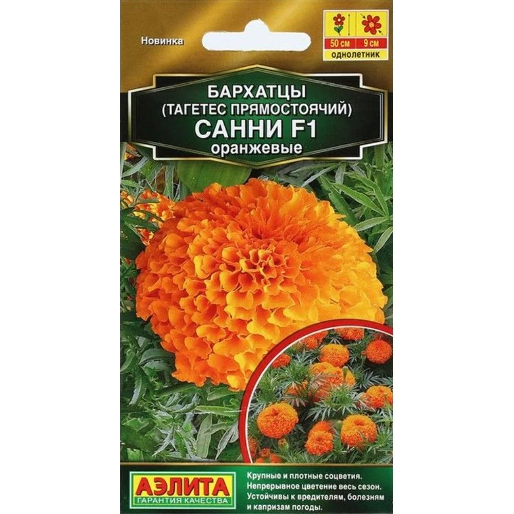 Гибрид с превосходными декоративными качествами. Махровые, по-настоящему крупные цветки достигают 8-9 см в диаметре. Бархатцы Санни F1 отличаются устойчивостью к болезням и вредителям. Серия ценится за простоту в уходе и непрерывное цветение на протяжении всего сезона. Растения среднерослые, высота* крепких, прямостоячих побегов до 40-50 см. Боковые стебли обеспечивают компактным кустикам аккуратную форму. Соцветия плотные, после дождя и полива влага не скапливается в основании лепестков. Цветки долго сохраняют яркость, свежесть и опрятный вид. Серия рекомендована для украшения клумб, бордюров, вазонов и букетов.