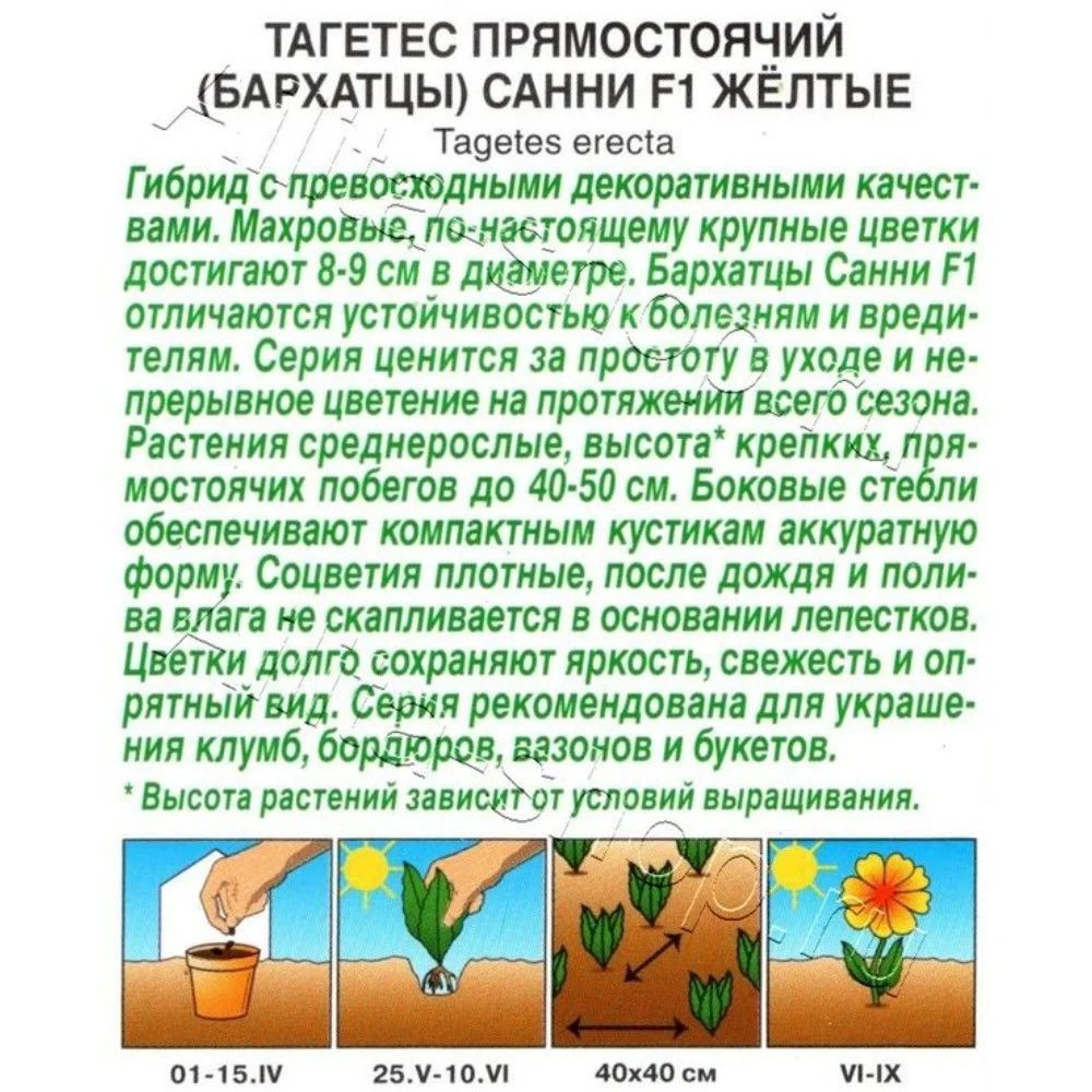 Гибрид с превосходными декоративными качествами. Махровые, по-настоящему крупные цветки достигают 8-9 см в диаметре. Бархатцы Санни F1 отличаются устойчивостью к болезням и вредителям. Серия ценится за простоту в уходе и непрерывное цветение на протяжении всего сезона. Растения среднерослые, высота* крепких, прямостоячих побегов до 40-50 см. Боковые стебли обеспечивают компактным кустикам аккуратную форму. Соцветия плотные, после дождя и полива влага не скапливается в основании лепестков. Цветки долго сохраняют яркость, свежесть и опрятный вид. Серия рекомендована для украшения клумб, бордюров, вазонов и букетов.