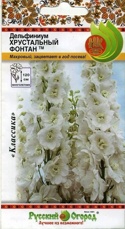 Пожалуй, это лучший в мире белый махровый дельфиниум! Огромные, белоснежные, красивой формы цветки собраны в плотные колосовидные соцветия. Цветение длительное и очень обильное за счет образования большого количества дополнительных цветоносов. Растения крепкие, сильные, не требуют подвязки. При своевременном удалении отцветших соцветий осенью возможно повторное цветение. Прекрасно выглядит в группах, миксбордерах, дает оригинальную срезку.Посев в теплице: февраль-август, в открытый грунт: март-апрель.Пересадка: июнь.Возможен посев под зиму с укрытием: сентябрь-октябрь.Семена прорастают в течение 10-12 дней при температуре 15 С. Не допускать переувлажнения или пересыхания посевов. Выращивание при температуре 20-25 С. Более высокая температура и условия длинного дня ускоряют зацветание. Условия короткого дня способствуют лучшему развитию розетки. После появления первых пяти листьев температуру лучше понизить до 15 ?С, что ускорит развитие розетки. А после окончательного её формирования световой день можно увеличить, а температуру немного повысить, что будет способствовать лучшему развитию цветоносов. Культура светолюбива, размещают на плодородных, достаточно влажных почвах.