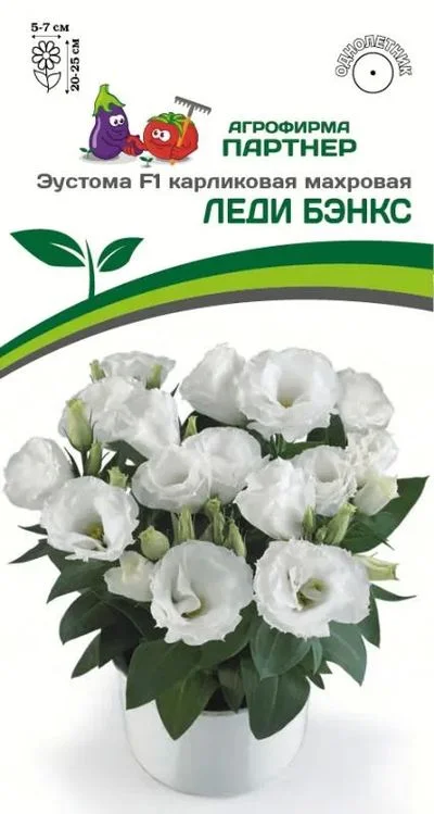 Лучшая контейнерная новинка для дома и сада! Чрезвычайно декоративную ЛЕДИ БЭНКС отличает компактность, прочность стеблей и исключительная выравненность растений. Отличное кущение позволяет закладывать большое количество бутонов, образуя невероятную шапку из цветков. Это миниатюрное растение формирует цветоносы практически из розетки листьев. Несоизмеримо крупные, густомахровые, ширококолокольчатые цветки до 7 см в диаметре расположены по несколько штук на верхушках стеблей и в пазухах листьев. Эустома отлично проявляет себя в садовых композициях: рокариях, альпинариях и цветниках. Представьте, как украсит Леди Бэнкс прохладный подоконник, сохраняя декоративность более 5 месяцев. Серия надежная, выносливая и устойчивая к капризам погоды и болезням, в том числе и к серой гнили (Botrytis). Чтобы уже в начале лета наслаждаться цветением, стоит своевременно позаботиться о выращивании рассады. Рекомендуемый объем кашпо – 3-5 л на одно растение или схема посадки в грунт – 20х20 см.