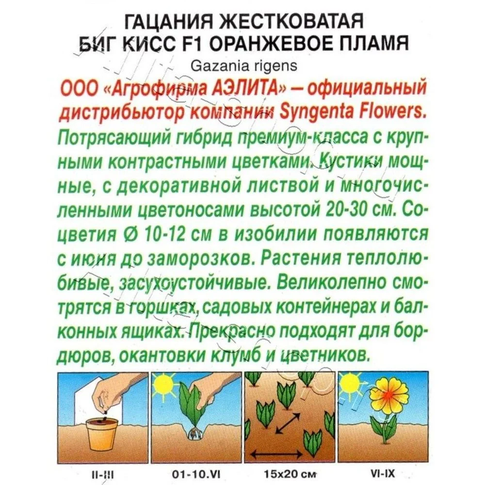 Потрясающий гибрид премиум-класса с крупными контрастными цветками. Кустики мощные, с декоративной листвой и многочисленными цветоносами высотой 20-30 см. Соцветия 10-12 см в изобилии появляются с июня до заморозков. Растения теплолюбивые, засухоустойчивые. Великолепно смотрятся в горшках, садовых контейнерах и балконных ящиках. Прекрасно подходят для бордюров, окантовки клумб и цветников. Для увеличения продолжительности цветения осенью гацанию пересаживают в вазоны и заносят в дом. Чтобы сохранить гибрид до следующего сезона, ему нужно обеспечить зимовку в светлом прохладном помещении (+8...+10°С).