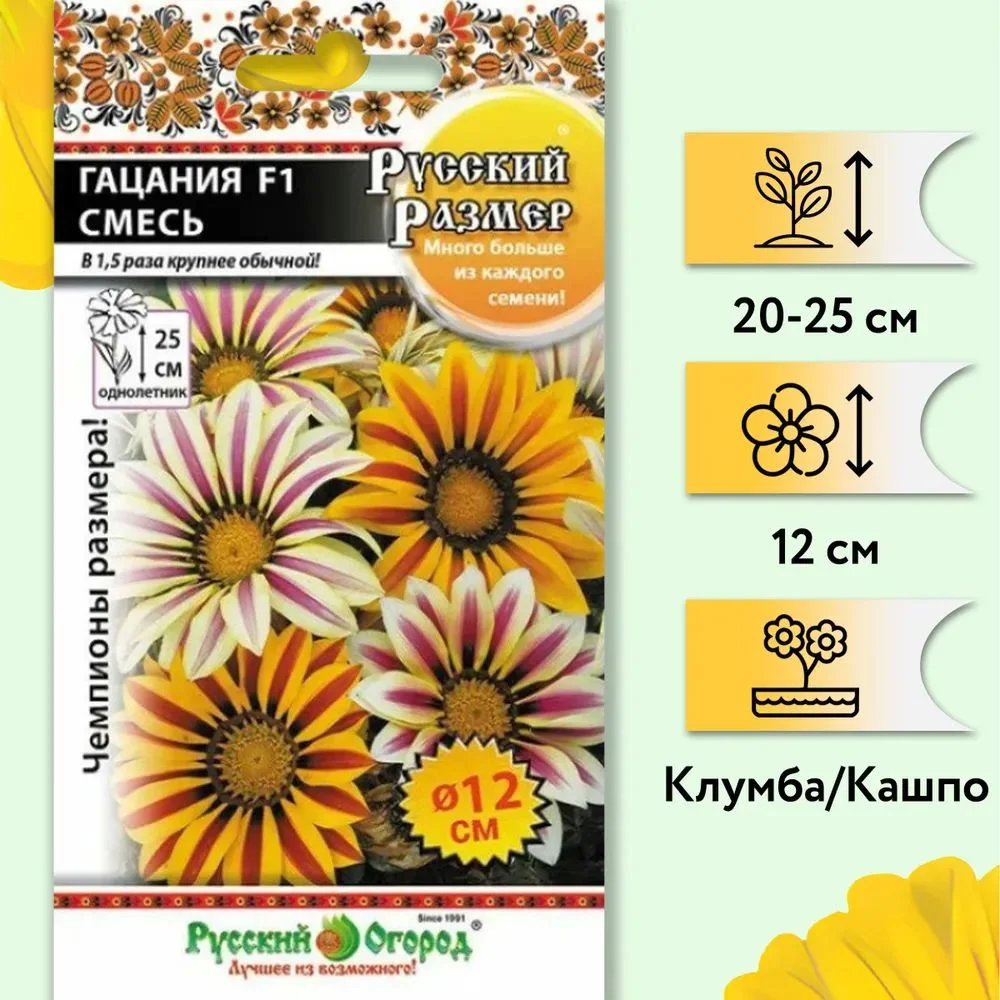 Гацания F1 Русский размер, смесь – дивной красоты, неприхотливые к условиям выращивания, прекрасные цветочные растения семейства Астровые.