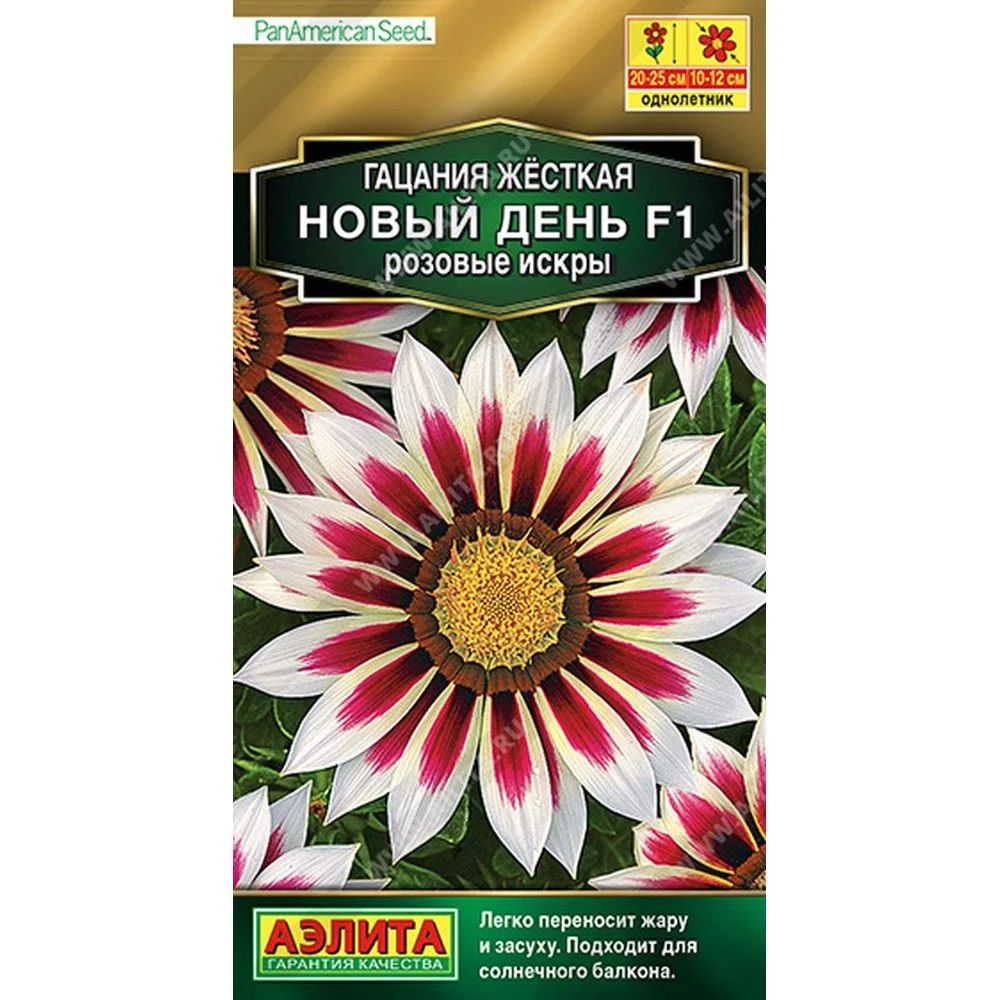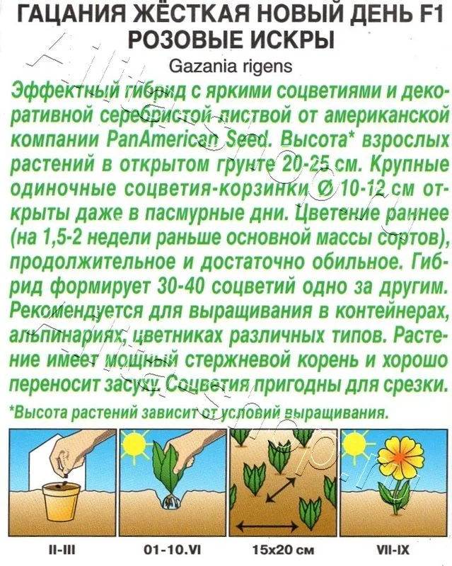 Эффектный гибрид с яркими соцветиями и декоративной серебристой листвой от американской компании PanAmerican Seed. Высота взрослых растений в открытом грунте 20-25 см. Крупные одиночные соцветия-корзинки 10-12 см открыты даже в пасмурные дни. Цветение раннее (на 1,5-2 недели раньше основной массы сортов), продолжительное и достаточно обильное. Гибрид формирует 30-40 соцветий одно за другим. Рекомендуется для выращивания в контейнерах, альпинариях, цветниках различных типов. Растение имеет мощный стержневой корень и хорошо переносит засуху. Соцветия пригодны для срезки. *Высота растений зависит от условий выращивания. Для увеличения продолжительности цветения осенью гацанию пересаживают в вазоны и заносят в дом. Чтобы сохранить гибрид до следующего сезона, ему нужно обеспечить зимовку в светлом прохладном помещении (+8...+10°С).