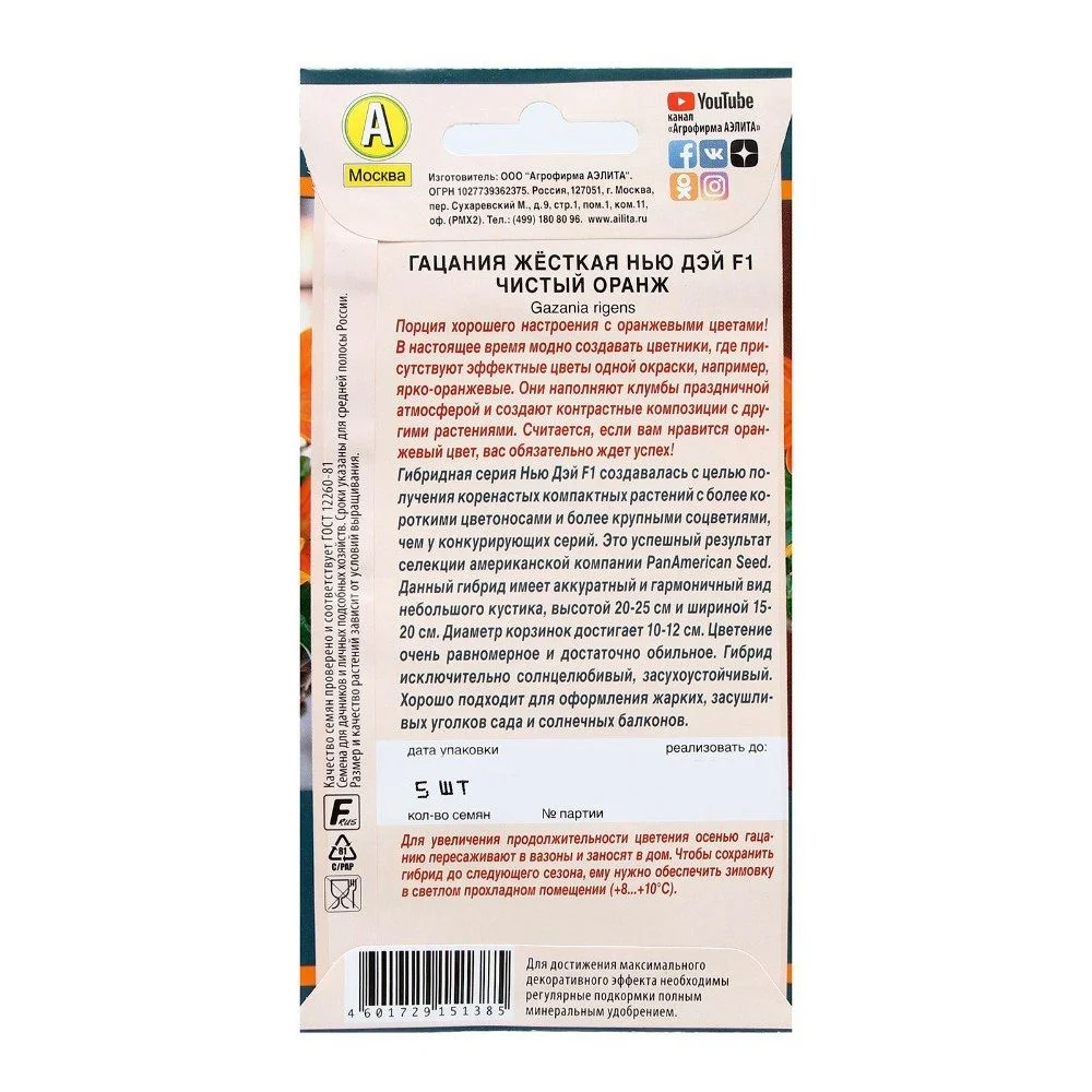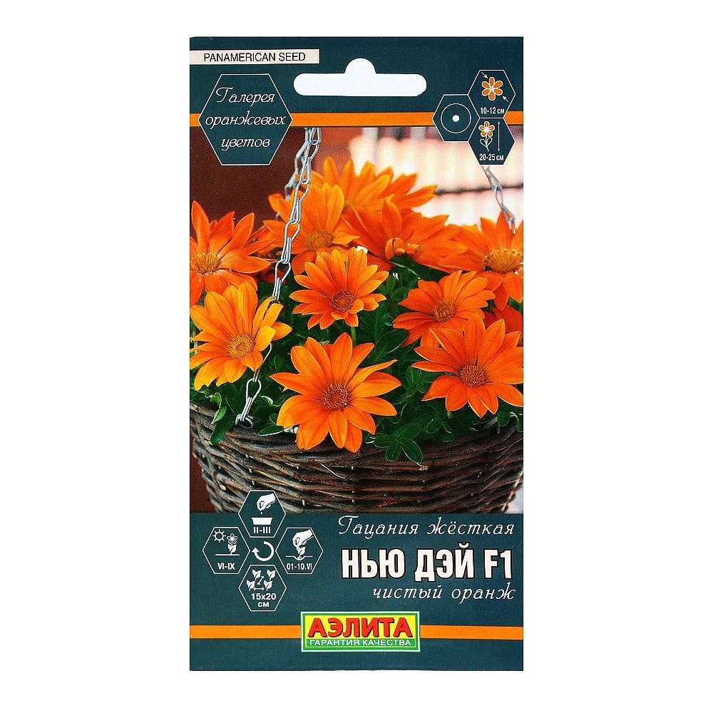 Порция хорошего настроения с оранжевыми цветами! В настоящее время модно создавать цветники, где присутствуют эффектные цветы одной окраски, например, ярко-оранжевые. Они наполняют клумбы праздничной атмосферой и создают контрастные композиции с другими растениями. Считается, если вам нравится оранжевый цвет, вас обязательно ждет успех! Гибридная серия Нью Дэй F1 создавалась с целью по лучения коренастых компактных растений с более короткими цветоносами и более крупными соцветиями, чем у конкурирующих серий. Это успешный результат селекции американской компании PanAmerican Seed. Данный гибрид имеет аккуратный и гармоничный вид небольшого кустика, высотой 20-25 см и шириной 15- 20 см. Диаметр корзинок достигает 10-12 см. Цветение очень равномерное и достаточно обильное. Гибрид исключительно солнцелюбивый, засухоустойчивый. Хорошо подходит для оформления жарких, засушливых уголков сада и солнечных балконов.Для увеличения продолжительности цветения осенью гацанию пересаживают в вазоны и заносят в дом. Чтобы сохранить гибрид до следующего сезона, ему нужно обеспечить зимовку в светлом прохладном помещении (+8...+10°С)