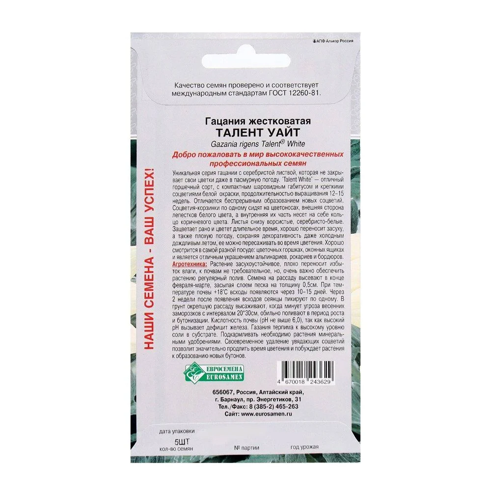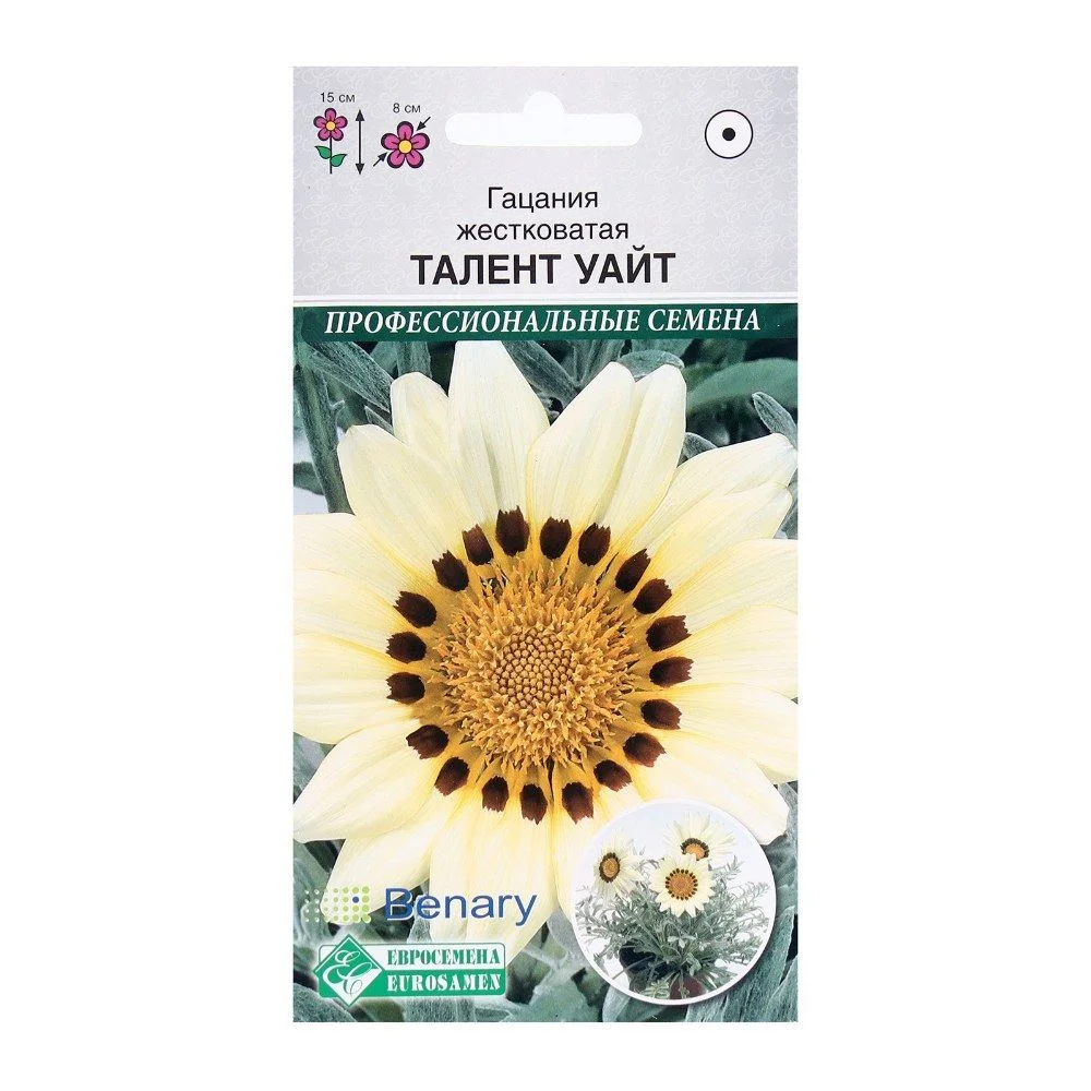 Уникальная серия гацании с серебристой листвой, которая не закрывает свои цветки даже в пасмурную погоду.'Talent White' -отличный горшечный сорт, с компактным шаровидным габитусом и крепкими соцветиями белой окраски, продолжительностью выращивания 12-15 недель.Отличается беспрерывным образованием новых соцветий.Соцветия-корзинки по одному сидят на цветоносах, внешняя сторона лепестков белого цвета, а внутренняя их часть несет на себе кольцо коричневого цвета.Листья снизу ворсистые, серебристо-белые.Зацветает рано и цветет длительное время, хорошо переносит засуху, а также плохую погоду, сохраняя декоративность даже холодным дождливым летом, ее можно пересаживать во время цветения.Хорошо смотрится в самой разной посуде: цветочных горшках, оконных ящиках и является отличным украшением альпинариев, рокариев и бордюров.Высота растения-15 см.Диаметр цветка-8 см.Растение засухоустойчивое, плохо переносит избыток влаги, к почвам не требовательное, но, очень важно обеспечить растению регулярный полив.Семена на рассаду высевают в конце февраля- марте, засыпая слоем песка на толщину 0,5 см.При температуре почвы +18 °С всходы появляются через 10-15 дней.Через 2 недели после появления всходов сеянцы пикируют по одному.В грунт окрепшую рассаду высаживают, когда минует угроза весенних заморозков с интервалом 20*30 см, обильно поливают в период роста и бутонизации.