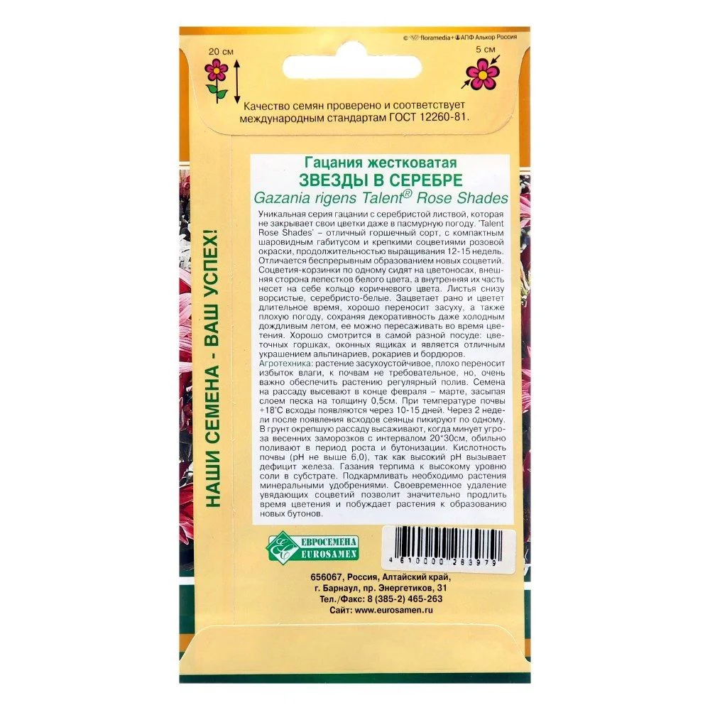 Яркая красотка!Отличная смесь с удачно подобранными расцветками газании садовой.Особая прелесть цветков – темные пятна, создающие в центре цветка очерченные кольцевые рисунки.Растение компактное, высотой около 20 см, с прочными цветоносами.Листья линейные и пальчато-рассеченные, зеленые с серебристым опушением, собраны в прикорневую розетку.На концах цветоносов распускаются соцветия, эффектные и крупные, 7-8 см в диаметре.Цветет с июня до заморозков. Используют в самых различных цветниках, как бордюрное растение, и как почвопокровник.Отлично сочетается с белым и синим агератумами.