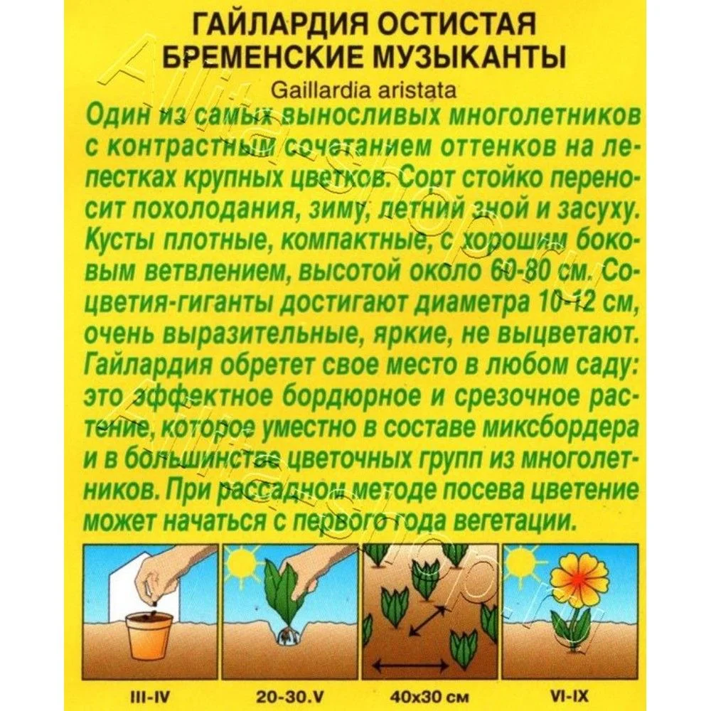 Один из самых выносливых многолетников с контрастным сочетанием оттенков на лепестках крупных цветков. Сорт стойко переносит похолодания, зиму, летний зной и засуху. Кусты плотные, компактные, с хорошим боковым ветвлением, высотой около 60-80 см. Соцветия-гиганты достигают диаметра 10-12 см, очень выразительные, яркие, не выцветают. Гайлардия обретет свое место в любом саду: это эффектное бордюрное и срезочное растение, которое уместно в составе миксбордера и в большинстве цветочных групп из многолетников. При рассадном методе посева цветение может начаться с первого года вегетации.