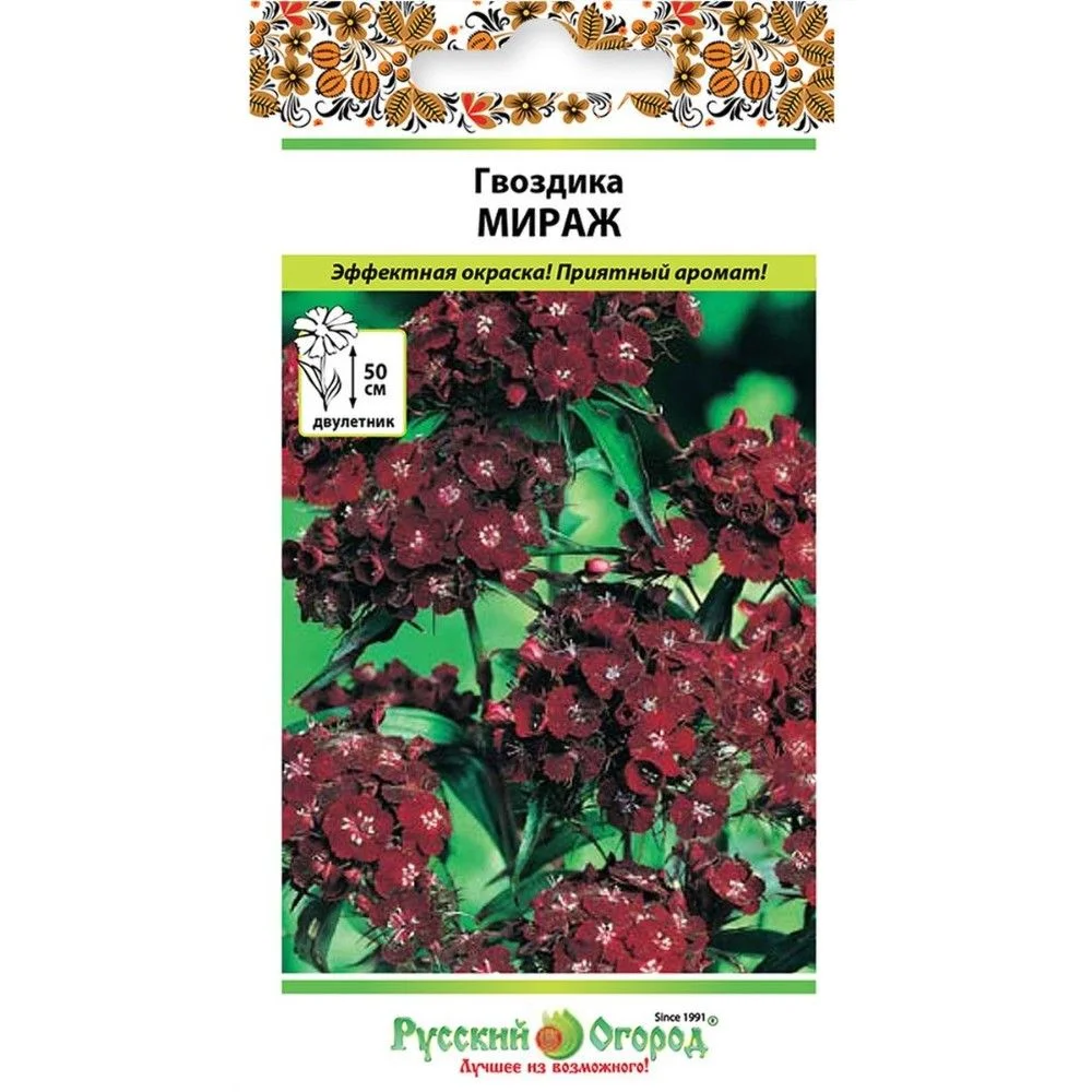 Семена гвоздики Мираж — прекрасный вариант для оформления садовых дорожек, наполнения клумб, а также создания потрясающих смешанных композиций. Высота взрослого растения не превышает 60 сантиметров. Весной на кустах распускаются соцветия, состоящие из многочисленных темно-бордовых цветов, которые наполняют воздух приятным ароматом. Этот сорт отлично смотрится в срезке. Семена гвоздики Мираж ценятся за высокую устойчивость к холоду. Перед посадкой растений рекомендовано дренировать выбранный участок. Размещая кусты, следует соблюдать между ними расстояние около 20 сантиметров.
