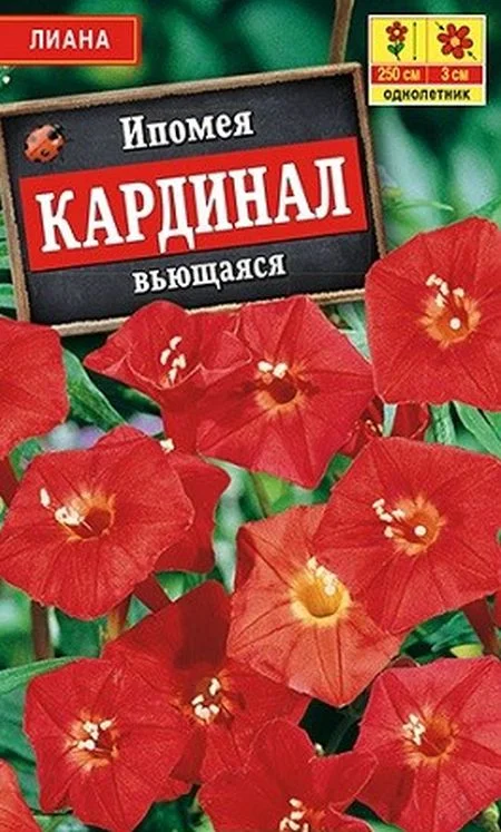 Изящная быстрорастущая однолетняя лиана. Растение способно активно взбираться вверх по любой опоре на высоту более 250 см. Кружевная листва очень декоративна, а в период цветения покрывается ярко-красными мелкими цветками, что делает растение очень эффектным и потрясающе красивым. Ипомея Кардинал вьющаяся используется для вертикального озеленения в саду и на балконах.Посев предварительно замоченными семенами, гнёздами по 2-3 шт. На высокоплодородных или переудобренных почвах наблюдается сильное развитие вегетативной массы в ущерб цветению. Влаго-, свето-, теплолюбива.