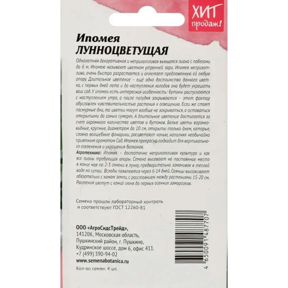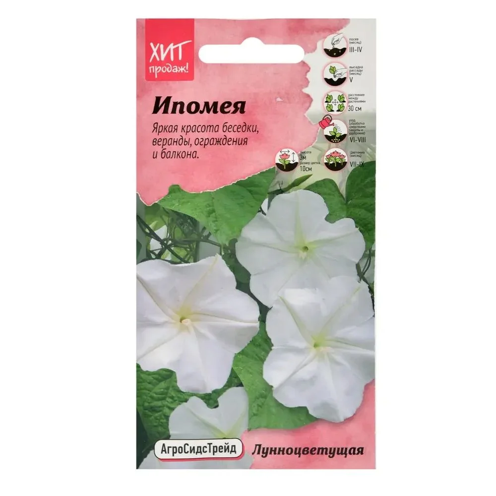 Агротехника: Ипомея – достаточно неприхотливая культура и как все лианы требующая опоры. Семена высевают на постоянное место в конце мая по 2-3 семени в лунку, предварительно замачивая в теплой воде на сутки. Всходы появляются через 6-14 дней. Сеянцы высаживают обязательно с комом земли, с расстоянием между растениями 15-20 см. Растения цветут с конца июня до первых осенних заморозков.