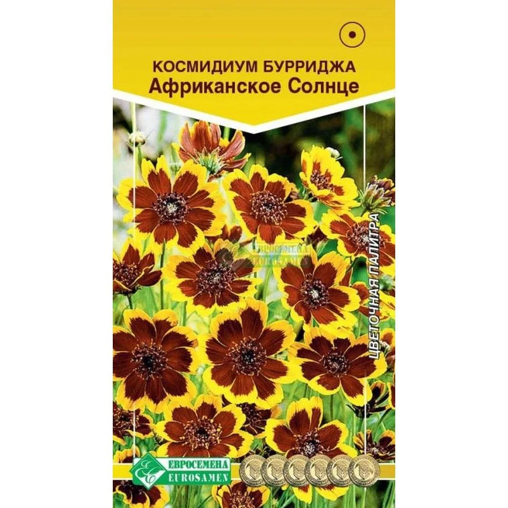 Космидиум – однолетнее и очень неприхотливое растение родом из Техаса. В декоративном садоводстве обычно используют сорт космидиум Бурриджа, который образует кустики с очень тонкими ветвистыми стеблями, перисто разделенными ажурными листьями и яркими цветками коричнево-красной окраски с желтой каймой по краю лепестков. Из-за этой отличительной способности в народе его называют «паутинкой».Цветки растения по внешнему виду похожи на кореопсис. На тонких, но прочных цветоносах, они, словно бабочки, порхают, переливаясь на ветру. Цветение космидиума продолжительное, с июля до заморозков, используется в бордюрных посадках, рабатках и для срезки, так как цветки продолжительное время стоят в срезке. В цветниках лучше сажать группой из нескольких экземпляров, так растение будет выглядеть более эффектно. Сочетать его нужно с цветами родственных окрасок: желтыми, золотистыми, оранжевыми календулами, рудбекиями, бархатцами, кореопсисами. Высота растения-50 см Диаметр цветка-3 см