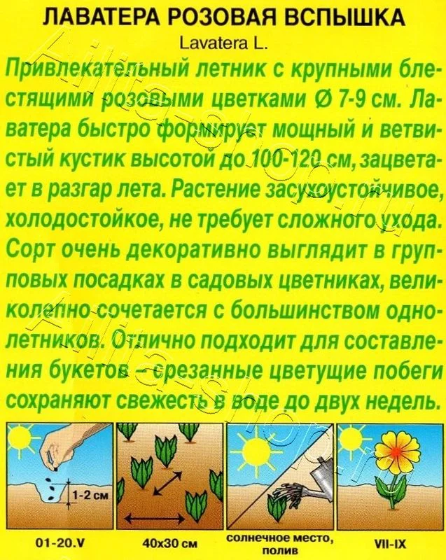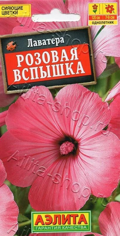 Привлекательный летник с крупными блестящими розовыми цв етками 7- 9 см. Лаватера быстро формирует мощный и ветвистый кустик высотой до 100-120 см, зацветает в разгар лета. Растение засухоустойчивое,  холодостойкое, не требует сложного ухода. Сорт очень декоративно выглядит в групповых посадках в садовых цветниках, великолепно сочетается с большинством однолетников. Отлично подходит для составления букетов – срезанные цветущие побеги сохраняют свежесть в воде до двух недель. Посев проводят гнездами по 2-4 шт. Для более раннего цветения возможен посев на рассаду в конце марта – начале апреля в отдельные горшочки. Лаватера предпочитает солнечные участки с рыхлыми почвами среднего плодородия. Не любит переувлажнения