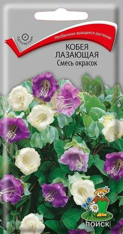 Необычное вьющееся растение. Цепляется за опору усиками, образует многочисленные побеги до 3м. Листья перистые. Цветы колокольчатые, фиолетовые и белые, диаметром 6-8 см. Цветёт с июля до заморозков.Агротехника. Растение свето- и теплолюбивое. На плодородных почвах растет быстро, покрывая большую поверхность. Хорошо реагирует на подкормки и полив. Используют для вертикального озеленения, на балконах. При выращивании рассады посевы проводят в конце февраля - начале марта в ящики. Глубина заделки семян 1,5 см. При температуре почвы +20°C всходы появляются на 14-20 день. Сеянцы в фазе первого настоящего листа пикируют по одному в горшочки. Для опоры ставят колышки. В открытый грунт растения высаживают в конце мая – начале июня, выдерживая расстояние между растениями 60-80 см.