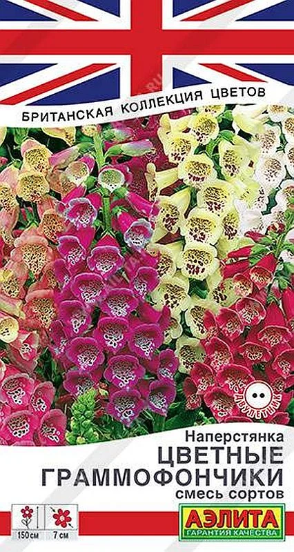 Красочная смесь эффектного величественного двулетника. Ее особенностью является горизонтальное расположение крупных цветков относительно побегов, что придает растению неповторимую декоративность. Наперстянка пластична к условиям освещенности. Приспосабливается к полутени, но цветки мельчают. Предпочитает рыхлые почвы, при застое весенних вод цветение может не наступить. Ввиду морозостойкости укрытие на зиму не требуется, но при мульчировании лучше развивается и богаче цветет. Высота прямостоячих побегов может превышать 130-150 см, цветки  6-7 см. Все виды наперстянок ядовиты, уход за растением проводите в перчатках! Семена практически не заделывают, слегка мульчируют песком и поддерживают во влажном состоянии до всходов. С появлением двух пар настоящих листьев сеянцы пикируют в отдельные горшочки. При посеве в открытый грунт в июне–июле цветет на 2-й год. Возможен подзимний посев.