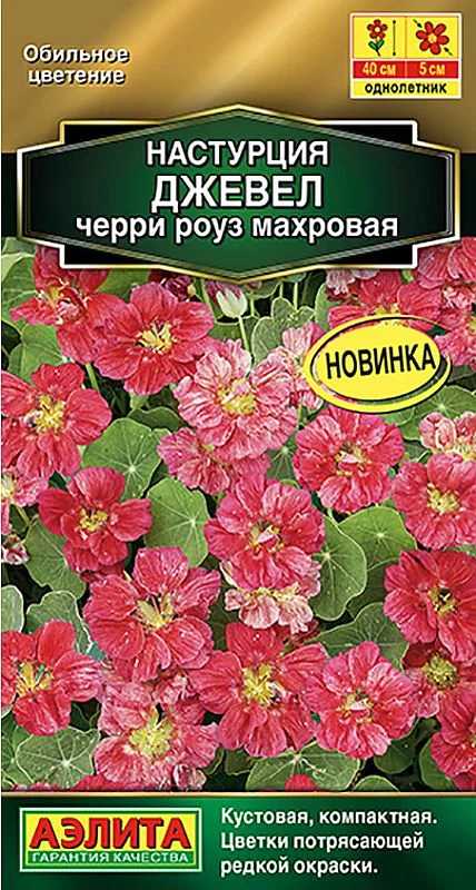 Компактный, кустовой сорт с цветками очень редкой вишнево-розовой окраски. Цветение раннее, очень обильное и продолжительное, с июня до первых заморозков. Кусты ветвистые, высотой 30-40 см. Цветки махровые и полумахровые,  4-5 см, располагаются над лис твой. Растения шикарно смотрятся на клумбах, в бордюрах и рабатках. Отлично подходят для выращивания в садовых контейнерах, подвесных корзинах и балконных цветочницах. Семена перед посевом желательно замочить. Настурция теплолюбива; хорошо растет и цветет на умеренно влажных почвах среднего плодородия. На высокоплодородных или переудобренных почвах наблюдается сильное развитие вегетативной массы в ущерб цветению