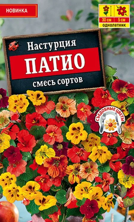 Сочетание всего многообразия оттенков настурции в одной смеси компактных сортов для украшения сада и балкона. Кустики высотой 25-30 см, имеют большое количество изящных, боковых побегов. Цветки  ? 4-5 см пышным облаком покрывают зеленый полог нежных листьев. Цветение длится до наступления устойчивых заморозков. Яркие, нежные цветки и сочные листья настурции – съедобные, обладают целебными свойствами, освежающим вкусом и пряным ароматом.Семена перед посевом желательно замочить. Настурция теплолюбива; хорошо растет и цветет на умеренно влажных почвах среднего плодородия. На высокоплодородных или переудобренных почвах наблюдается сильное развитие вегетативной массы в ущерб цветению.