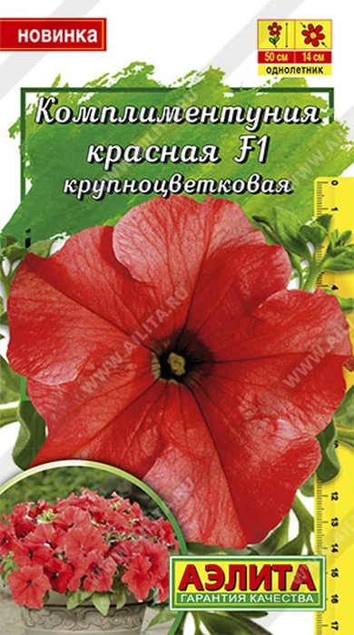 «Давайте говорить друг другу комплименты”. Когда трудно подобрать нужные слова, на помощь придут цветы. Комплиментуния–стильное, эффектное и очень изящное растение. Это романтичный, практичный выбор и комплимент на языке цветов. Комплиментуния–эксклюзивный гибрид (новая петуния) с крупными цветками и суперобильным цветением. Украсит любой цветник и будет долго дарить радость и восхищение. Благодаря наличию гена мужской стерильности семян не завязывает, направляя всю энергию на формирование новых цветков. Форма растений кустовая, со склонностью к трейлингу: ширина больше высоты. Высота 50 см, ширина 40-50 см. Быстро разрастается. Растения устойчивы к болезням, выдерживают дождливую и ветреную погоду, переносят кратковременные заморозки до –5°С и экстремальную жару до +40°С без потери декоративности.