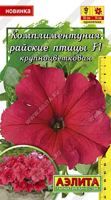 «Давайте говорить друг другу комплименты”. Когда трудно подобрать нужные слова, на помощь придут цветы. Комплиментуния–стильное, эффектное и очень изящное растение. Это романтичный, практичный выбор и комплимент на языке цветов. Комплиментуния–эксклюзивный гибрид (новая петуния) с крупными цветками и суперобильным цветением. Украсит любой цветник и будет долго дарить радость и восхищение. Благодаря наличию гена мужской стерильности семян не завязывает, направляя всю энергию на формирование новых цветков. Форма растений кустовая, со склонностью к трейлингу: ширина больше высоты. Высота 50 см, ширина 40-50 см. Быстро разрастается. Растения устойчивы к болезням, выдерживают дождливую и ветреную погоду, переносят кратковременные заморозки до –5°С и экстремальную жару до +40°С без потери декоративности.