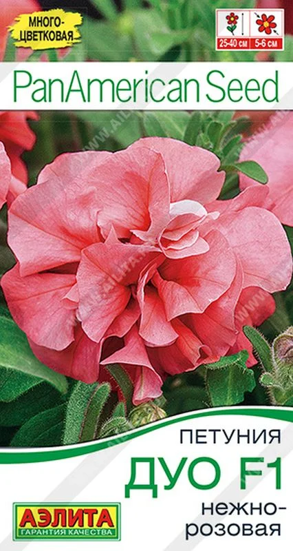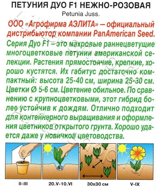 Серия Дуо F1 – это махровые раннецветущие многоцветковые петунии американской селекции. Растения прямостоячие, крепкие, хорошо кустятся. Их габитус достаточно компактный: высота 25-40 см, ширина 25-30 см. Цветки 5-6 см. Цветение обильное. По сравнению с крупноцветковыми, этот гибрид более устойчив к дождям. Отлично подходит для контейнерного выращивания и оформления цветников открытого грунта. Хорошо удается даже у новичков цветоводства. Семена в гранулах! Гранулы располагают на поверхности почвы, не заделывая их, хорошо увлажняют из распылителя. При попадании влаги на гранулу оболочка должна раствориться. Посевы накрывают стеклом для сохранения постоянной влажности до полных всходов. Февральским посевам требуется дополнительная подсветка.