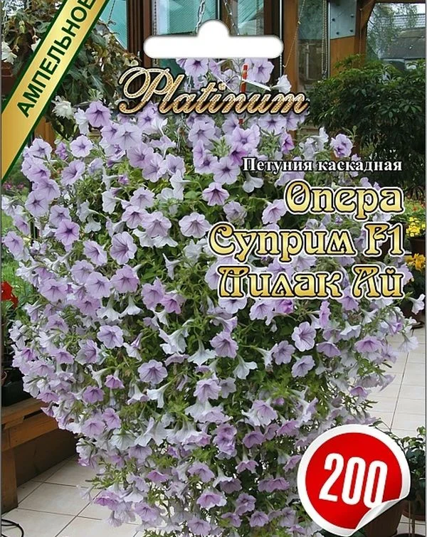 Петуния Опера Суприм Лилак Ай F1 – каскадный однолетник с милыми голубовато-сиреневыми цветами. Сорт отличается обилием нежных цветов с приятным ароматом, неприхотливостью в уходе, пригодностью для декорирования подвесных корзин, вазонов и кашпо. Длина побегов – до 120 см.На рассаду каскадный сорт можно сеять с января по март. Для посадки берут легкий, питательный грунт. Можно использовать готовые субстраты, разбавленные песком. Посев – поверхностный, проращивание – в тепличных условиях (под стеклом или пленкой). Рассаду после пикировки закаливают, в открытый грунт высаживают в мае-июне.
