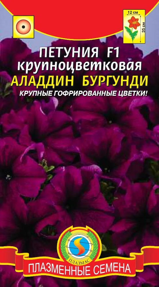 Для петуний серии Аладдин характерен компактный куст, высотой до 35см, с небольшими листочками и очень крупный цветок, до 13см в диаметре. Воронка раскрывшегося цветка загибается в сторону основания, края воронки гофрированы.