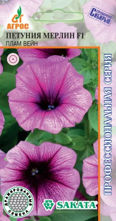 Серия Мерлин. Многолетнее растение, выращиваемое как однолетнее. Куст компактный, неполегающий, обильноцветущий, диаметр цветка 6,5 см. Растения очень однородны, устойчивы к неблагоприятным погодным условиям. Петуния - относительно неприхотливое и очень пластичное растение. Хорошо растет на солнечных местах, но может выносить и небольшое затенение. К почвам нетребовательна, выносит засуху, похолодание и небольшие заморозки. Полив умеренный. Семена на рассаду высевают со второй половины марта до апреля, рассыпая их по поверхности почвы. Сверху закрывают стеклом или пленкой, ставят в помещение с температурой 20-23°С и часто опрыскивают водой. Всходы появляются через 8-10 дней. В открытый грунт рассаду высаживают со второй половины мая. Для обильного цветения необходимы подкормки комплексным удобрением раз в 10-15 дней. Петуния широко используется в городском озеленении, ее высаживают на клумбах, рабатках, бордюрах. Прекрасно смотрится в контейнерах и кашпо.