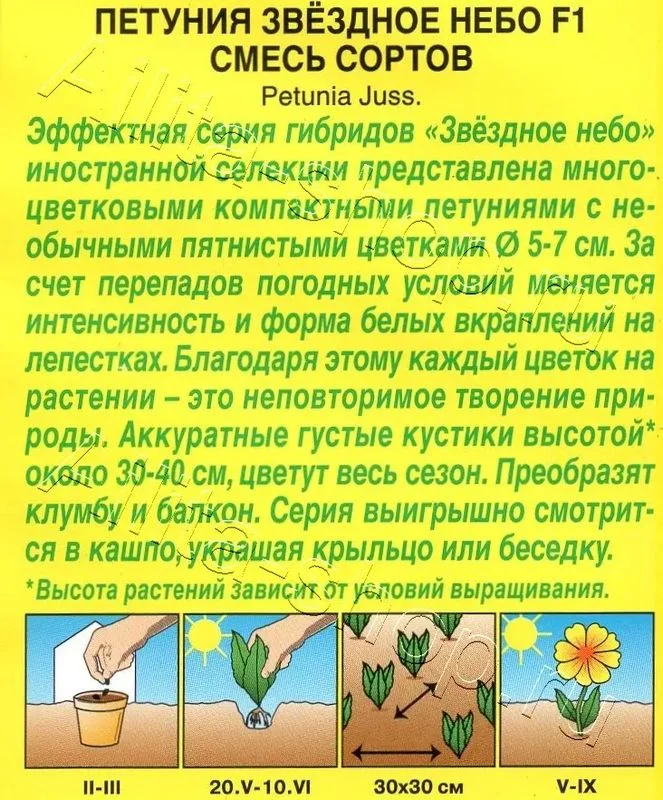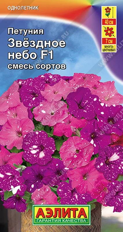 Эффектная серия гибридов «Звёздное небо» иностранной селекции представлена многоцветковыми компактными петуниями с необычными пятнистыми цветками 5-7 см. За счет перепадов погодных условий меняется интенсивность и форма белых вкраплений на лепестках. Благодаря этому каждый цветок на растении – это неповторимое творение природы. Аккуратные густые кустики высотой* около 30-40 см, цветут весь сезон. Преобразят клумбу и балкон. Серия выигрышно смотрится в кашпо, украшая крыльцо или беседку.