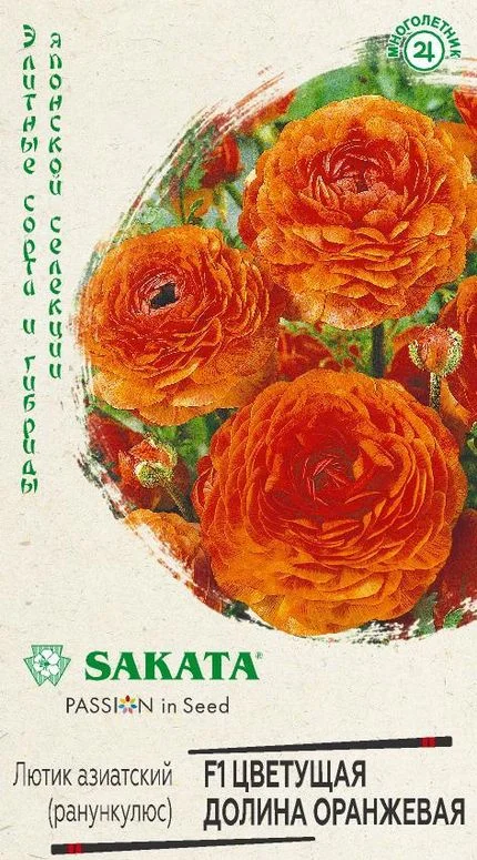 Карликовое многолетнее растение высотой всего 20-25 см идеально подойдет для выращивания в горшечной культуре или создания ярких цветущих клумб и бордюров. Очаровательные оранжевые, махровые цветки, диаметром 8 см, похожи при раскрытии бутонов на розочки, а в полном роспуске - на миниатюрные махровые маки. Стебель простой с небольшими глубоко рассечёнными листьями. Цветет в конце июня-июле. В феврале-марте семена поверхностно высевают в ящик, заполненный чуть влажной, рыхлой землей и слегка присыпают. Затем емкость с землей переносят в темное прохладное помещение и содержат при температуре +2-(+7)°С (стратификация). Через 45-50 дней посевы помещают в освещенное место, аккуратно увлажняют из пульверизатора и накрывают стеклом. На 10-12 день начинают появляться первые ростки. В мае, когда высота сеянцев достигает 10 см, их высаживают в садовый парничок на расстоянии 10-15 см друг от друга или в отдельный горшок (для выращивания на балконе). После окончания заморозков растения переносят в открытый грунт. Молодые сеянцы ранункулюса образуют за сезон полноценные клубеньки и зацветают. Осенью клубеньки выкапывают и просушивают, хранят при температуре 4-60С. Весной, перед посадкой, их на сутки замачивают в воде и высаживают через 15-30 см.