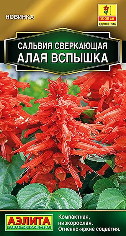 Компактный сорт сальвии с огненно-алыми плотными соцветиями. Крепкие низкорослые кустики высотой * 20-30 см зацветают в самом начале лета. На протяжении всего теплого сезона растения обладают аккуратным видом и насыщенной окраской листьев и соцветий. Сорт отличается повышенной устойчивостью к жарким, засушливым условиям. Эффектный летник проявляет всю свою декоративность при высадке группами в цветниках и в горшечной культуре. * Высота растений зависит от условий выращивания. Сальвия предпочитает солнечные участки, с хорошо дренированными, умеренно плодородными почвами среднего мех.состава и нейтральной кислотности. Не любит переувлажнения. В фазе 3-4 пар листьев проводят формирующую прищипку рассады для лучшего кущения.