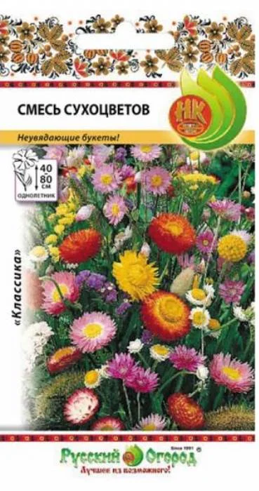 Очень популярная смесь сухоцветов для создания оригинальных зимних композиций. Срезанные в полуроспуске цветы подвешивают вниз соцветиями в прохладном темном месте для досушивания. Все растения прекрасно сохраняют свой первоначальный цвет.