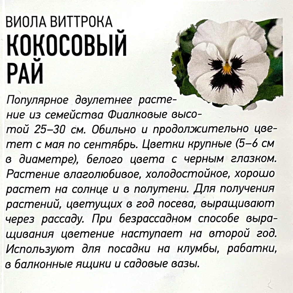 Популярное двулетнее растение из семейства Фиалковые высотой 25-30 см. Обильно и продолжительно цветет с мая по сентябрь. Цветки крупные (5-6 см в диаметре), белого цвета с черным глазком. Растение влаголюбивое, холодостойкое, хорошо растет на солнце и в полутени. Для получения растений, цветущих в год посева, выращивают через рассаду. При безрассадном способе выращивания цветение наступает на второй год. Используют для посадки на клумбы, рабатки, в балконные ящики и садовые вазы.