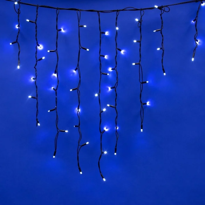 Гирлянда "Бахрома" представляет собой гибкий горизонтальный шнур со свисающими вертикально нитями разной длины, на которых располагаются светодиоды.