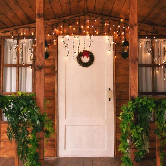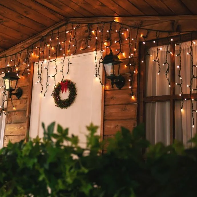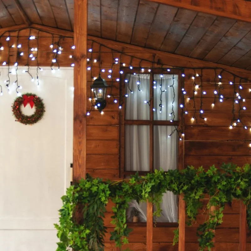 - карниз загородного дома, офиса, магазина; - оконные и дверные проёмы; - периметр беседки; - между осветительными столбами поперёк и вдоль улиц; - на городских площадях и в парках.