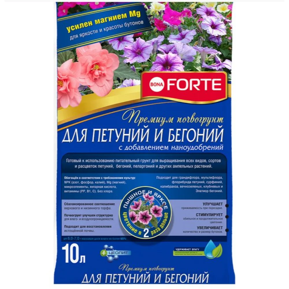 • Премиум ПОЧВОГРУНТ ДЛЯ ПЕТУНИЙ И БЕГОНИЙ содержит основные питательные вещества и элементы, но их может быть недостаточно для крупных, обильноцветущих растений, особенно при контейнерном содержании. Цветущие растения требуют много питательных элементов, поэтому с появлением первой волны обильного цветения рекомендуется дополнительно использовать жидкое комплексное удобрение Bona Forte для петуний и балконных цветов, водорастворимое удобрение Bona Forte для бегоний, пеларгоний и других ампельных с аминокислотами, а также сухое гранулированное пролонгированное удобрение Bona Forte для петуний и бегоний с биодоступным кремнием.