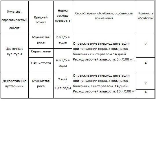 Цветочные растения (мучнистая роса 2 мл/5 л воды , серая гниль, пятнистости 4 мл/5 л ) ,опрыскивание в период вегетации при появлении первых признаков болезни.