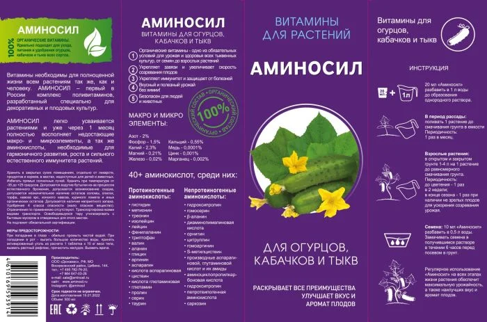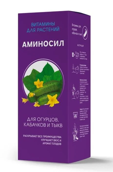 Аминосил - абсолютная новинка! Полный комплекс витаминов для огурцов, кабачков и тыкв. Впервые в России! Подкормка - 100% органический состав. Аминосил создан для полноценного сбалансированного питания всех сортов огурцов. Витамины Аминосил укрепляют растение, защищают корневую систему, формируют сильный естественный иммунитет, повышает стрессоустойчивость. Аминосил выполняет ту же функцию, что и традиционные витамины для человека, позволяя жить полноценной здоровой жизнью даже при стрессовых ситуациях. Благодаря микро и макро-элементам органического происхождения Аминосил дарит длительное цветение и плодоношение, а так же обеспечивает качественный рост и развитие растения. Витамины Аминосил принимают активное участие в процессе метаболизма растений. По сути, они представляют собой элементы или кирпичики, благодаря которыми происходит строительство растительных клеток.  Состав:
