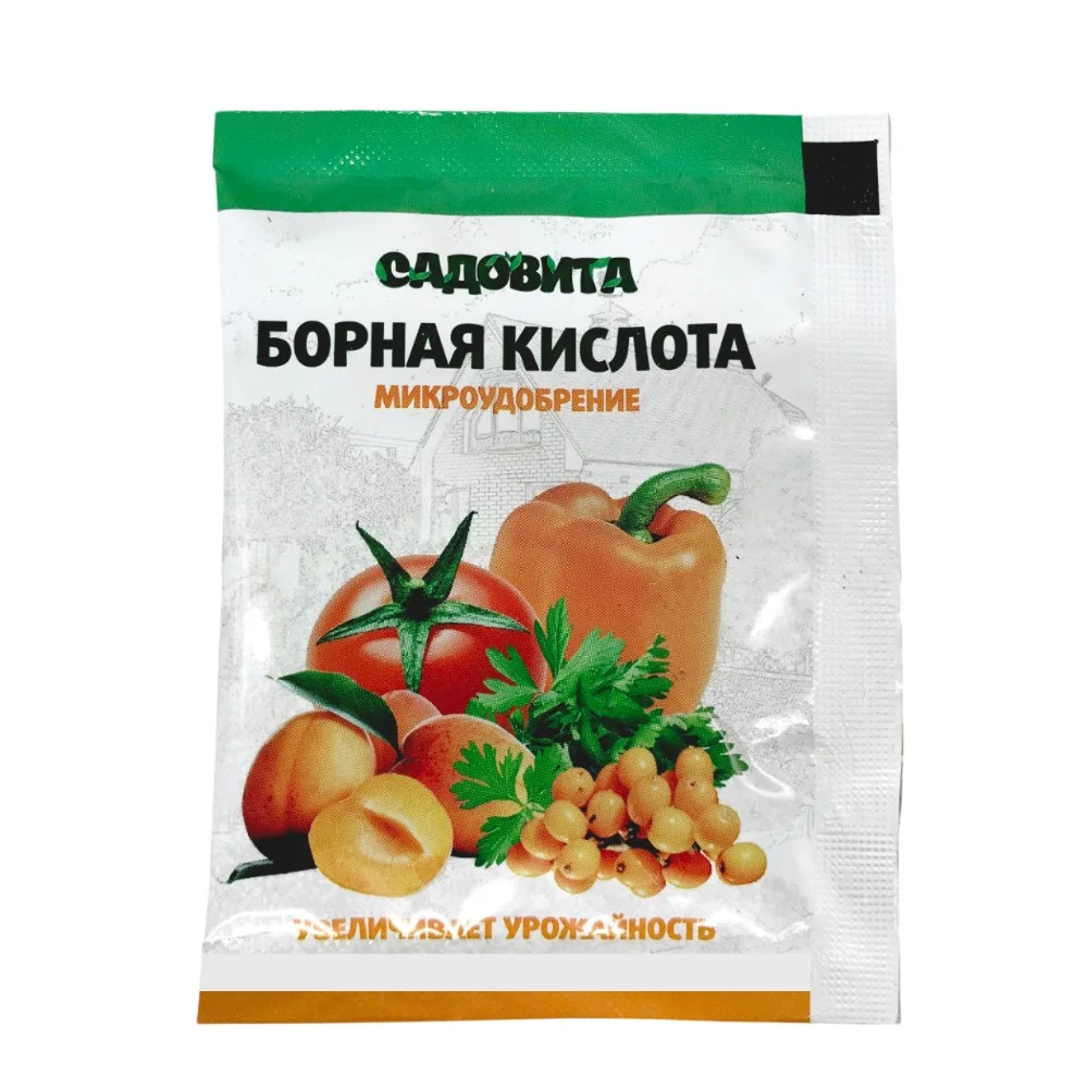 Это универсальное удобрение, источник бора для любых культур и рассады. Подойдет как для овощных и плодовых и ягодных культур (томат, капуста, картофель, огурцы, кабачки, клубника и др.), так и для деревьев, кустарников, садовых и комнатных цветов. Томаты особенно чувствительны к нехватке бора, потому включить кислоту в процесс ухода за культурой нужно еще до начала сезона.
