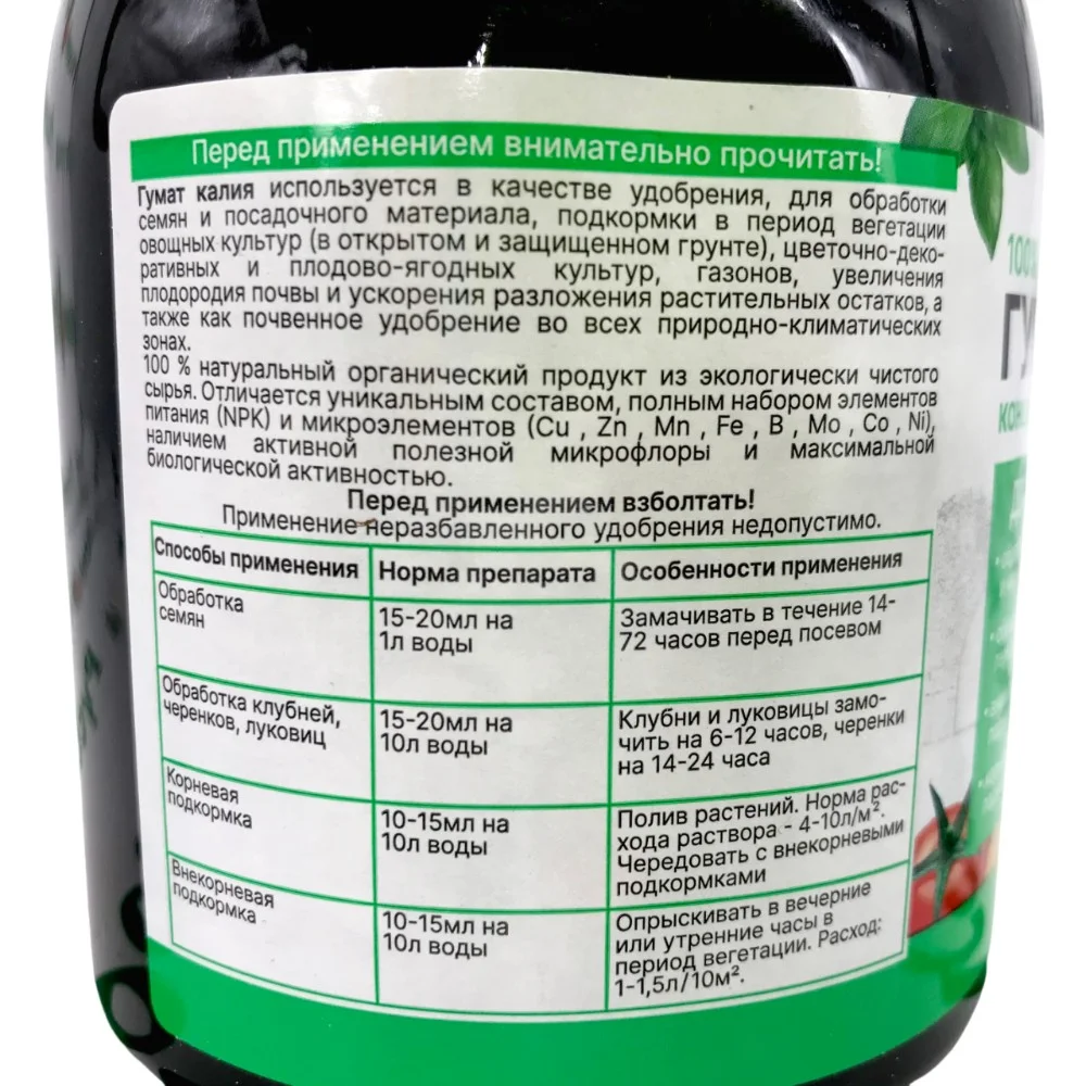 Гумат калия можно использовать совместно с минеральными и органическими удобрениями, но не рекомендуется одновременно применять с фосфорными удобрениями.