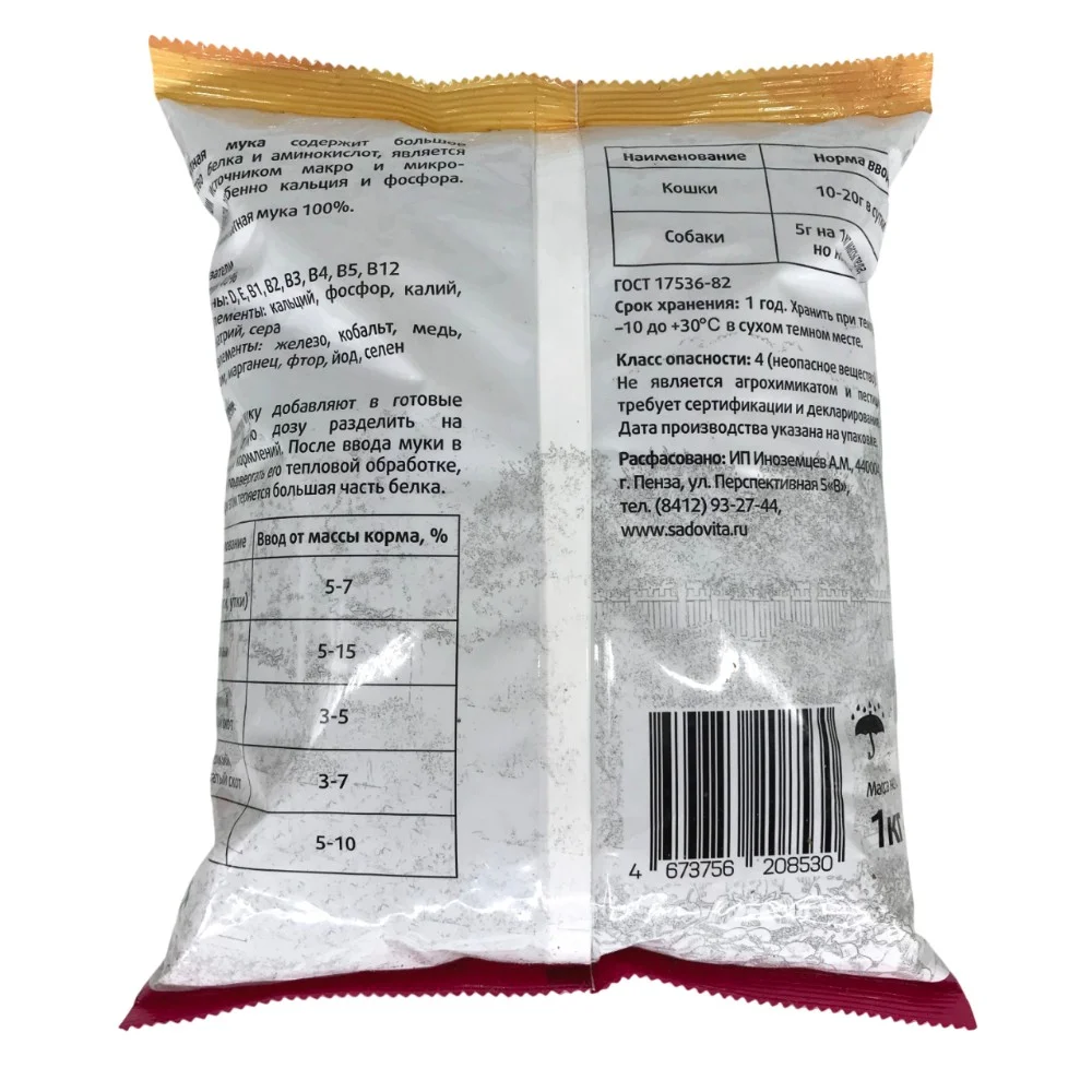 Мясокостная мука 1кг САДОВИТА, содержит большое колличество белка и аминокислот, является хорошим источником макро и микро-элементов, особенно кальция и фосфора. Состав: мясокостная мука 100%.
