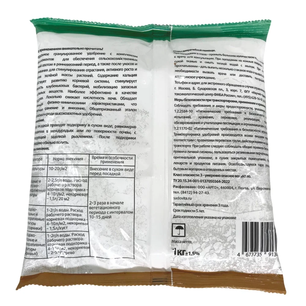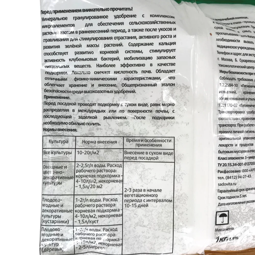 Удобрение Селитра кальциевая (кальций азотнокислый) Садовита 1кг - это минеральное удобрение, содержащее кальций и азот. Оно используется для повышения урожайности и качества растений, а также для укрепления их иммунитета. Удобрение состоит из кристаллических гранул, которые растворяются в воде. Особенностью данного удобрения является его способность улучшать качество почвы и увеличивать ее плодородие. Преимуществами являются высокая эффективность, длительное действие и удобство в использовании.