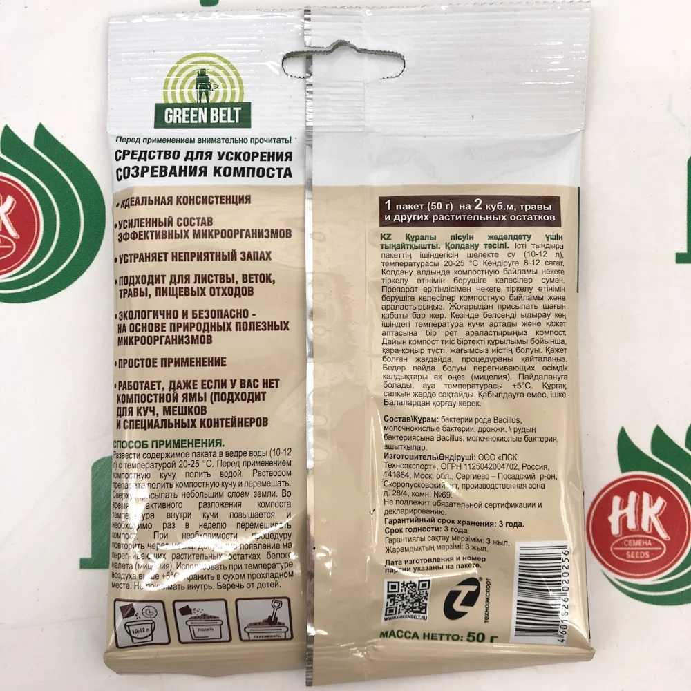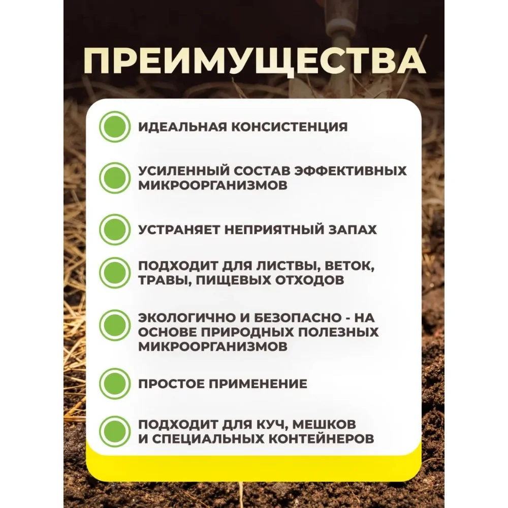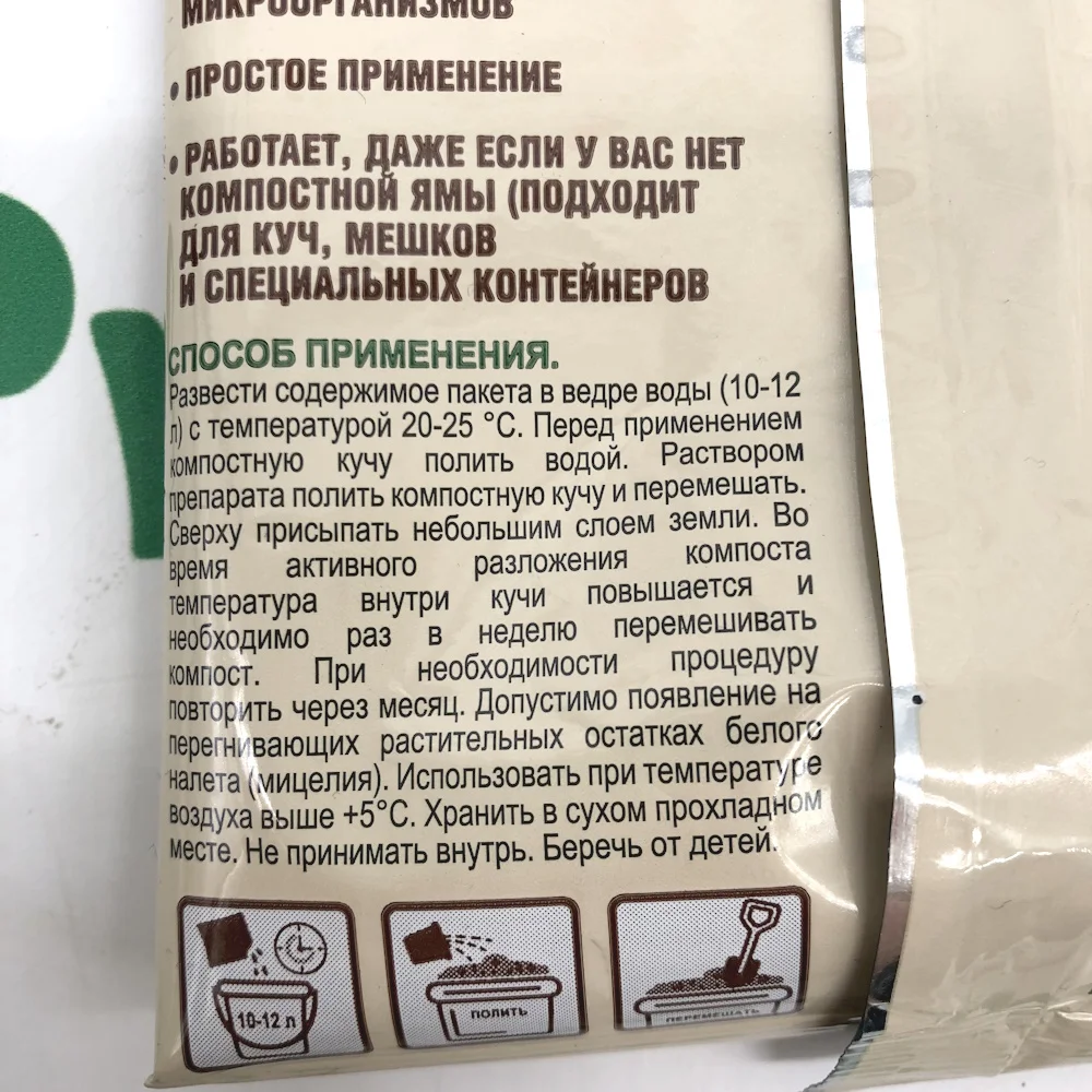Препарат для компоста  – это биологический препарат. В его состав входит комплекс микроорганизмов, которые в природе занимаются разложением органических отходов. Ускоряет созревание компоста в 3 - 4 раза быстрее, превращаясь в качественное органическое удобрение, пригодное для внесения в почву. Имеет идеальную консистенцию, устраняет неприятный запах. Работает, даже если у Вас нет компостной ямы (подходит для куч, мешков и специальных контейнерв).